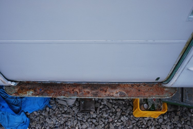 クラウドファンディングにご協力いただいた皆様、完成披露が大変遅くなっており申し訳ございません。2025年も、最終的な塗装前仕上げに向けて作業を続けております。しかしながら、古い車体ゆえ、作業を進めるほど新たな修復箇所が発見され、その対処のため計画以上に時間がかかっております。今年行った作業としては、(1)ドアステップおよび車体裾の仕上げ、(2)ドアの修復、(3)正面窓Hゴムの交換と修理 を行い、現在も進行中です。