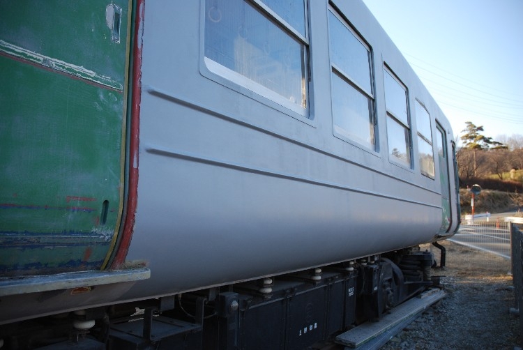 車体裾のアール部分も上を向いたままの作業のため大変疲れます。面積も広いので、これもまた終わりの見えない作業です。2両分の仕上げをするのはもう修行みたいなものでした。