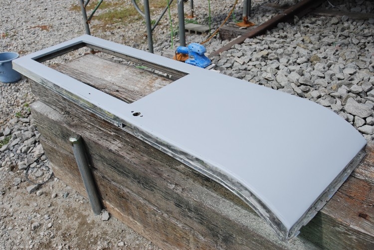 ドアはアルミ製で塗装の傷みは少なかったため、剥がれたところのみパテで補修し、その他の部分は表面を削ってなだらかに仕上げました。一部、ガイドローラーのレールが浮いたり剥がれたりした部分がありましたので、塗装後に修復予定です。